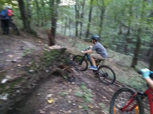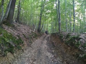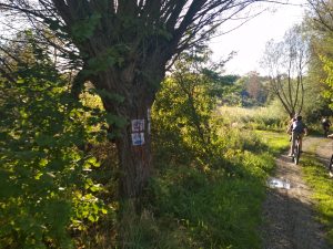 Jadąc dalej wzdłuż Dłubni zatrzymaliśmy się na chwilę przy stopniu wodnym. Ku naszemu zdziwieniu poziom wody okazał się bardzo niski mimo opadów deszczu dzień wcześniej. Trasa prowadziła dalej wierzbową alejką, aż dotarliśmy do celu czyli wspomnianego Lasu na pograniczu Książniczek i Młodziejowic. Wjechaliśmy do wąwozu zatrzymując się przy „krzywym drzewie” i robiąc sobie pamiątkowe zdjęcie. Nieco dalej podziwialiśmy strome podjazdy i zjazdy. Sądząc po śladach jest to miejsce dla miłośników dwóch kółek z silnikiem i tylną oponą wgryzającą się w grunt… Wróciliśmy do początku innego wąwozu, którym wyjechaliśmy z lasu drogą wijącą się jak wąż prosto na polanę, z której rozpościerał się piękny widok na okolice te bliższe i te nieco dalsze… bo widać było również Babią Górę!