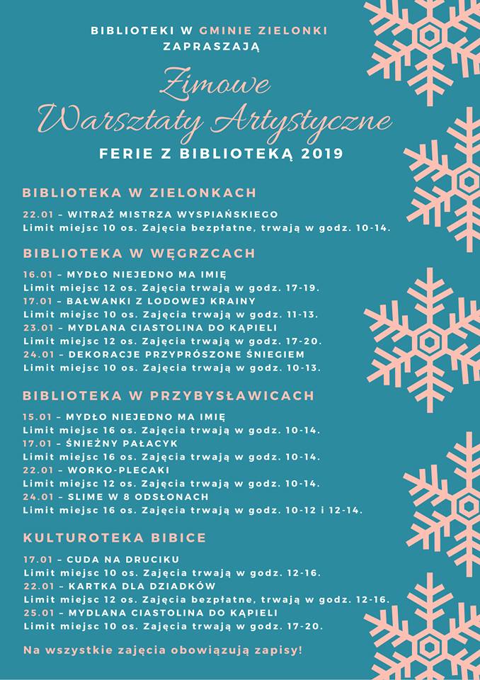Biblioteka Publiczna w Zielonkach wraz z filiami w Węgrzcach, Przybysławicach oraz Bibicach zaprasza dzieci i młodzież do udziału w Zimowych Warsztatach Artystycznych, organizowanych w ramach „Ferii z Biblioteką 2019”. Od 14 do 27 stycznia młodzi czytelnicy będą mogli skorzystać z bogatej oferty zajęć przygotowanej przez nasze placówki specjalnie na zimowy wypoczynek.