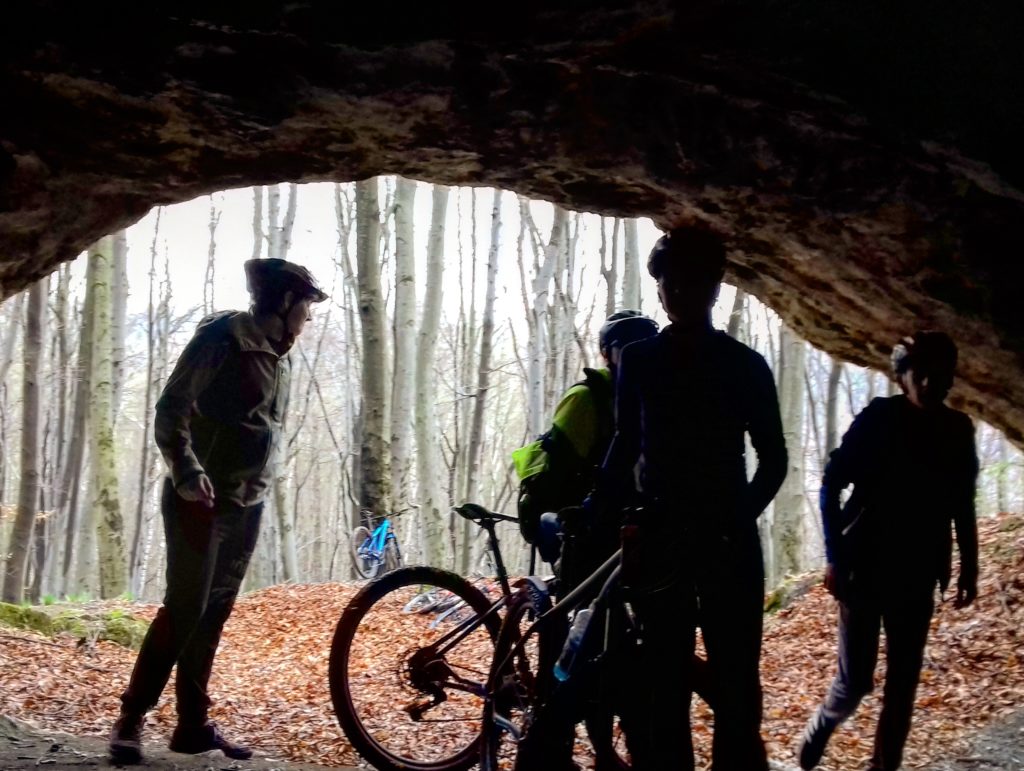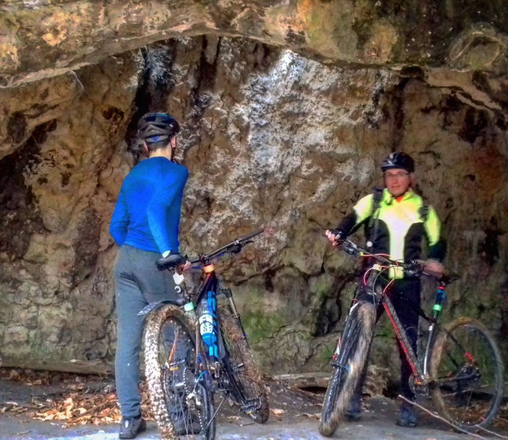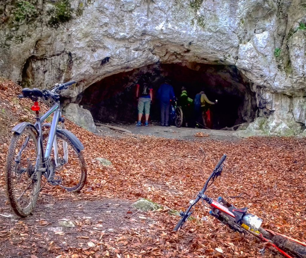A my powróćmy do relacji z dzisiejszej jakże udanej wycieczki do Ojcowa. Określając tą wycieczkę jedynie jako „Wycieczka do Ojcowa” nie wyrażamy tego co dokładnie widzieliśmy i gdzie byliśmy. Nasz prowadzący zabrał nas swoją ulubioną trasą o nazwie „Ojców z lotu ptaka”. Co takiego kryje się pod tą intrygującą nazwą, mogliśmy przekonać się po wdrapaniu się do góry z Doliny Prądnika do miejscowości Maszyce. Podjazd leśnym wąwozem wydawał się nie mieć końca, a im dalej tym bardziej stromo. Prowadzący obiecał jednak nagrodę w postaci pięknego widoku z góry na Dolinę Prądnika i dotrzymał słowa. Dodatkowo jeszcze odwiedziliśmy Jaskinię Maszycką – taka dość nietypowa jaskinia z „dziurą w suficie”. Tu niestety musieliśmy pożegnać dwóch uczestników: Ambrożego i Samuela, gdyż w jednym z rowerów urwał się hak mocujący przerzutkę i nie można było kontynuować dalszej jazdy. A że koledzy byli razem więc Ambroży pozostał z Samuelem, by towarzyszyć w podróży powrotnej do Krakowa autobusem komunikacji miejskiej. Dostaliśmy informację, że dotarli bezpiecznie do miasta. Szkoda, że tak się stało, ponieważ od powrotu do Krakowa dzielił nas już tylko zjazd wąwozem do Doliny Prądnika.