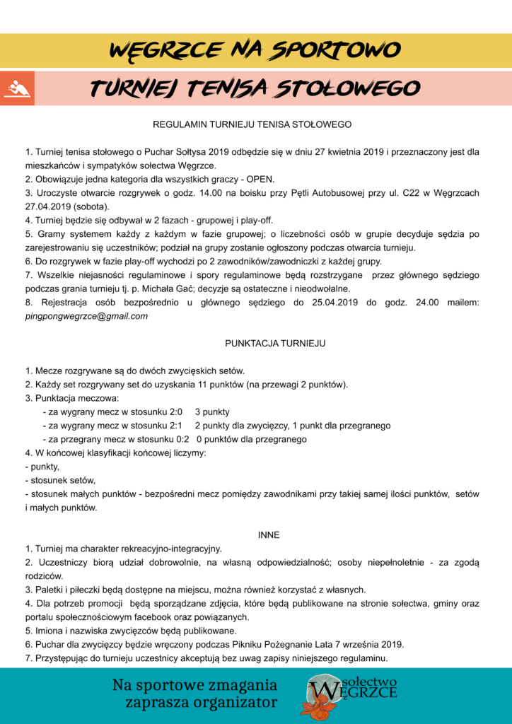 Węgrzce na sportowo – regulamin turnieju tenisa stołowego