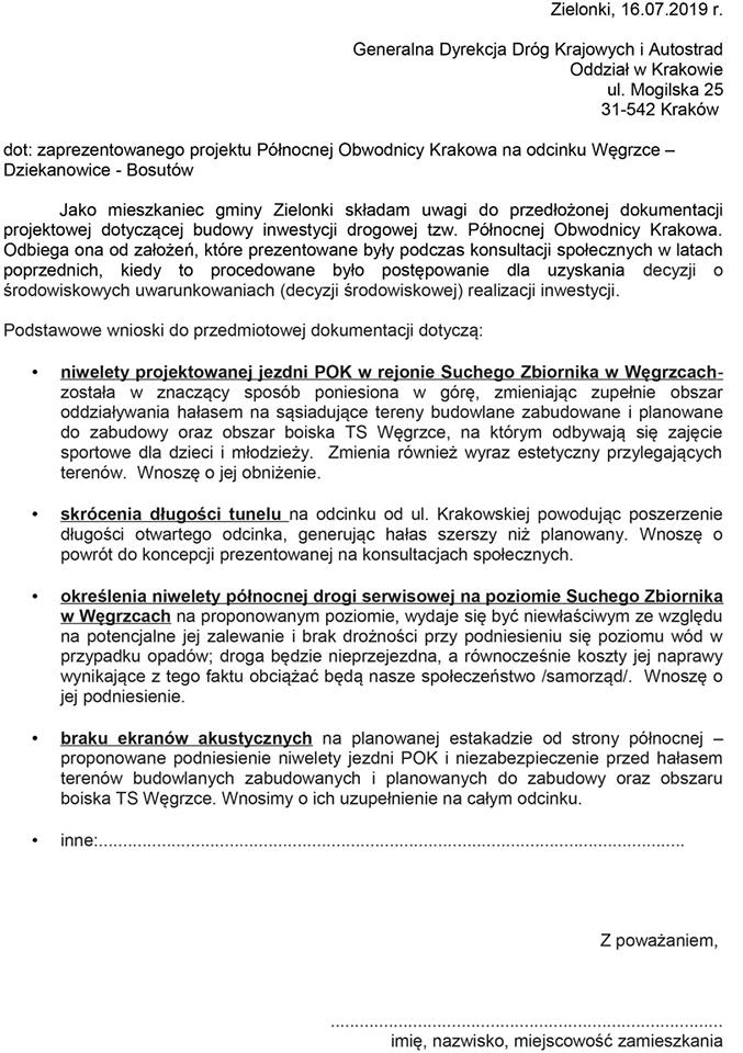W porozumieniu między sołectwami zachęcamy mieszkańców Węgrzc, Bosutowa i Dziekanowic o złożenie do GDDKiA wniosku o uwzględnienie uwag do zaprezentowanych rozwiązań projektowych dotyczących Północnej Obwodnicy Krakowa planowanej po naszym terenie. Przygotowaliśmy treść, z możliwością uzupełnienia o uwagi własne. Mieszkańcy Węgrzc do środy 24.07 mogą wrzucić do skrzynki pocztowej wiszącej na ogrodzeniu posesji sołtysa ul. A9 nr 10 wydrukowany i podpisany druk lub dostarczyć bezpośrednio do adresata.