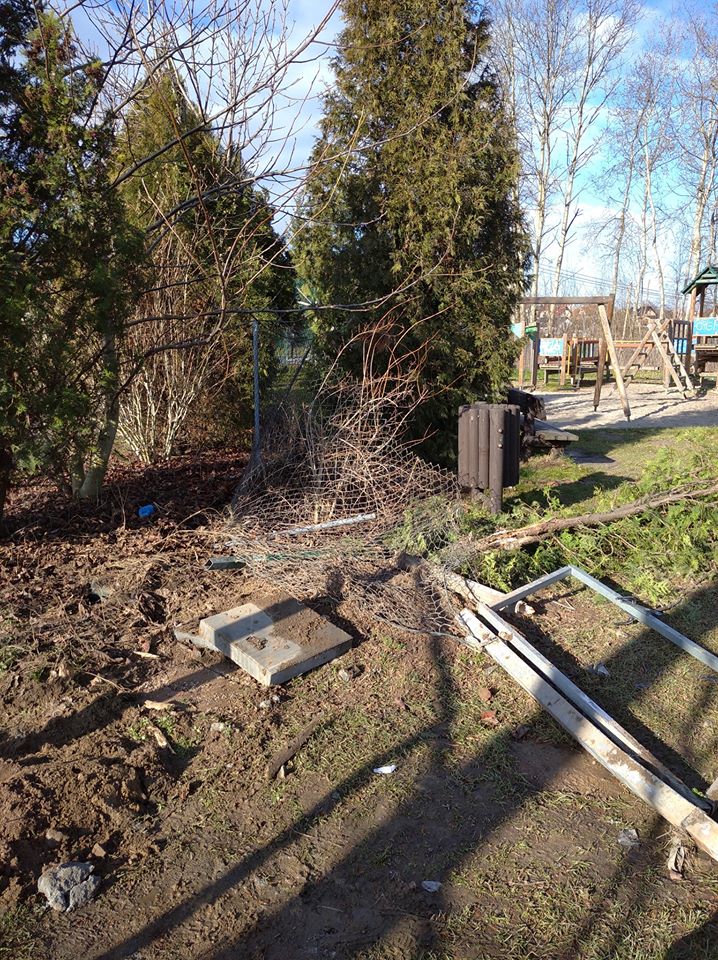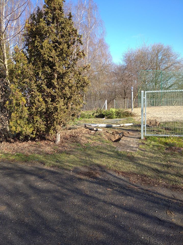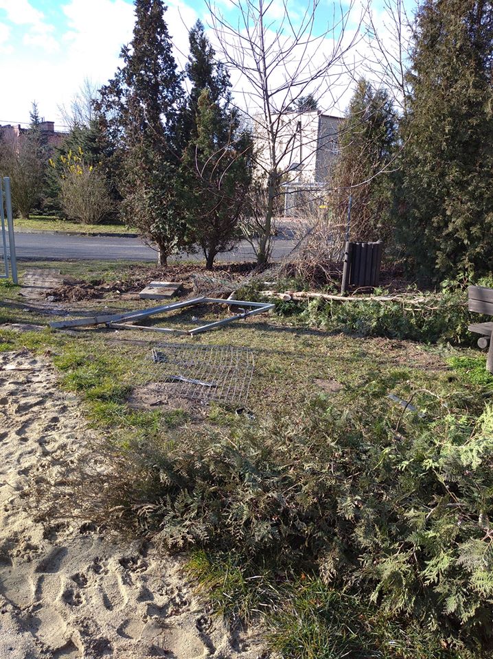 Tak od ok. 4 nad ranem wygląda wejście na plac zabaw przy pętli autobusowej na ul. C22 po tym jak wjechał do niego samochód. Prosimy mieszkańców o kontakt z policją w Zielonkach lub sołtysem w przypadku posiadania informacji o zajściu lub posiadających monitoring obejmujący ul. C1 lub C22.