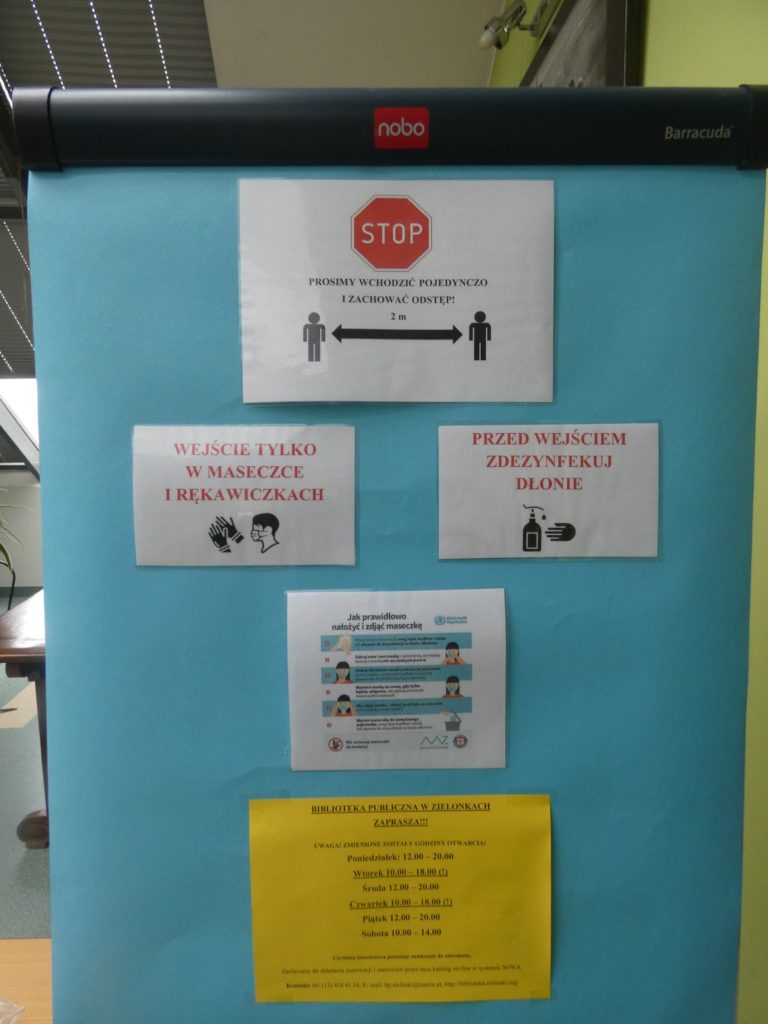 Z radością ogłaszamy, że w dniu dzisiejszym Biblioteka Publiczna w Zielonkach oraz filie w Bibicach, Przybysławicach i Węgrzcach wznowiły działalność! Czytelnicy mogą rezerwować i wypożyczać książki z zachowaniem zasad bezpieczeństwa sanitarnego. Jak wiadomo, w obecnej sytuacji dobra profilaktyka to podstawa. W związku z tym w bibliotekach należy przebywać z zasłoniętymi ustami oraz nosem (najlepiej przy użyciu maseczki ochronnej) oraz w jednorazowych rękawiczkach, które trzeba założyć tuż po wejściu do budynku, zaraz po zdezynfekowaniu rąk. Rękawiczki oraz płyn do dezynfekcji znajdują się w holu. W trosce o nasze wspólne bezpieczeństwo czytelnicy nie mają dostępu do półek bibliotecznych. Książki są wydawane w specjalnie przygotowanym miejscu przy wejściu do wypożyczalni, które jest regularnie dezynfekowane przez bibliotekarzy. Podczas oczekiwania na swoją kolej na korytarzu, należy zachować co najmniej dwumetrowy odstęp. Oddane książki będą przechowywane przez trzy dni w odosobnionym miejscu. Gorąco zachęcamy do ponownego korzystania z oferty bibliotecznej. Rezerwacji książek najlepiej dokonywać poprzez katalog internetowy lub drogą telefoniczną.