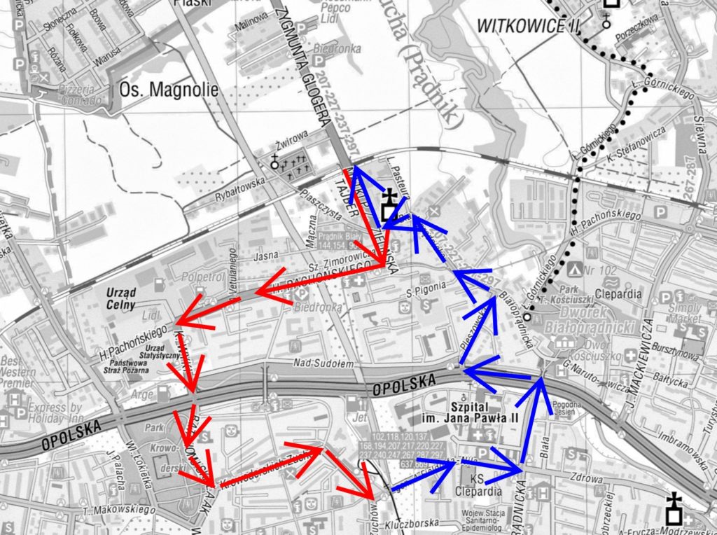 Zarząd Transportu Publicznego w Krakowie informuje, że w związku z budową linii tramwajowej z pętli Krowodrza Górka na Górkę Narodową od 19. września 2020 r. (sobota) ulegnie zmianie organizacja ruchu w rejonie ul. Pleszowskiej i Opolskiej. Linie aglomeracyjne nr 207, 227, 237 oraz 297 zmierzające w kierunku pętli Krowodrza Górka skierowane zostaną na trasy objazdowe: od przystanku „Glogera” autobusy pojadą ulicami: Glogera, Pachońskiego, Wyki, Batalionu Skała AK, Krowoderskich Zuchów do pętli Krowodrza Górka. Patrz: czerwone strzałki, mapka obok. W kierunku Gminy Zielonki trasy autobusów nie ulegną zmianie.