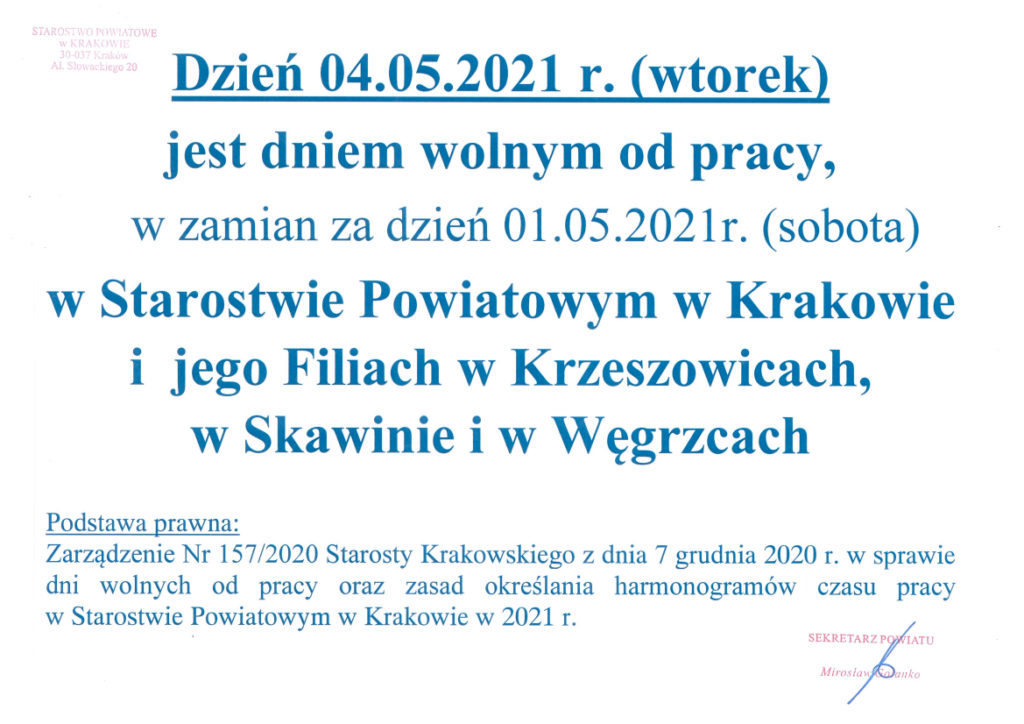 Dzień 04.05.2021 wolny od pracy w Starostwie Powiatowym