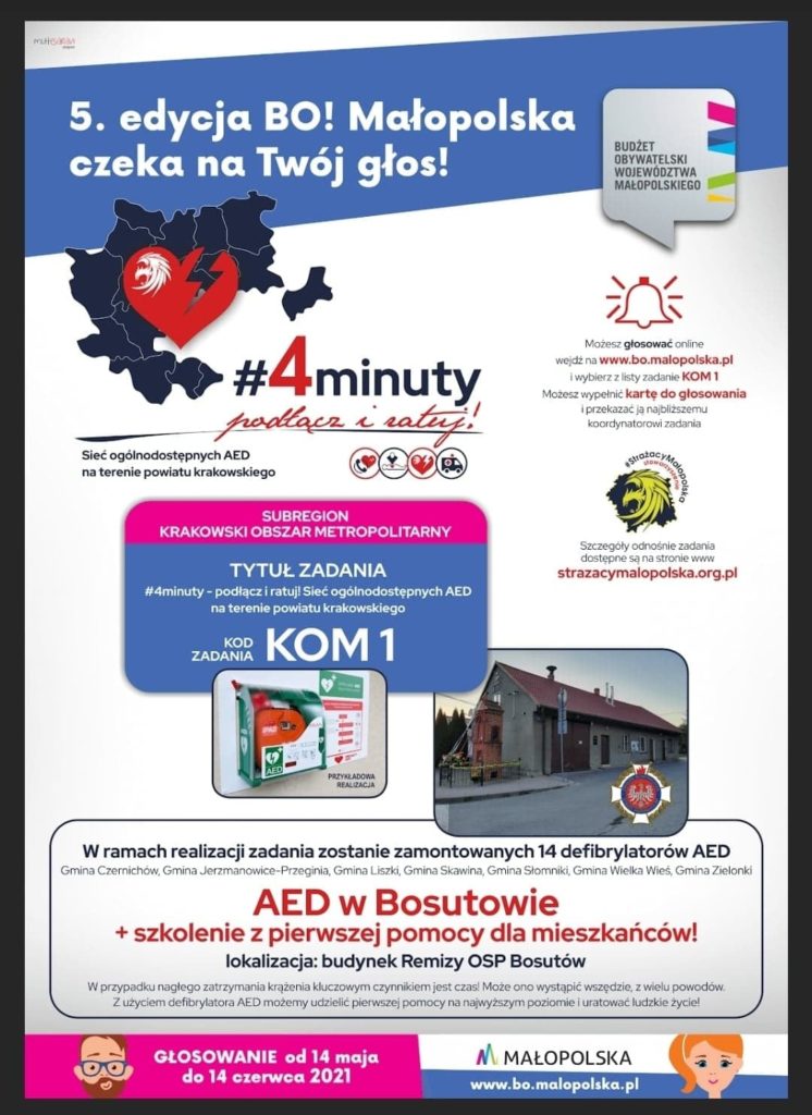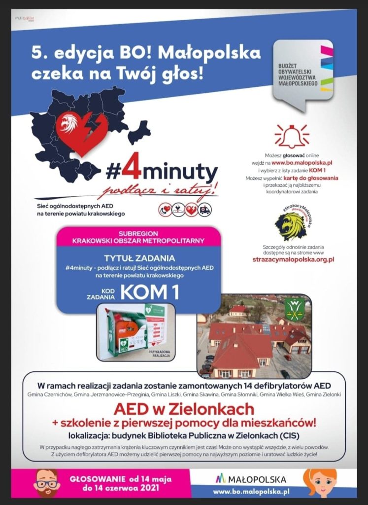 Możemy mieć wpływ gdzie trafią środki z Budżetu Obywatelskiego. Zagłosujmy na inicjatywę, która może byc zrealizowana u nas w gminie. AED w 3 miejscach w gminie + szkolenie dla chętnych mieszkańców. Warto oddać swój głos.