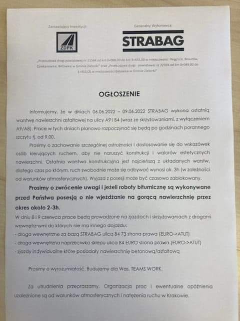 Poniedziałek do środy planowane jest asfaltowanie ul. A9 i B4 od ok. 9 rano. Szczegóły w ogłoszeniu wykonawcy. Prosimy o współpracę.