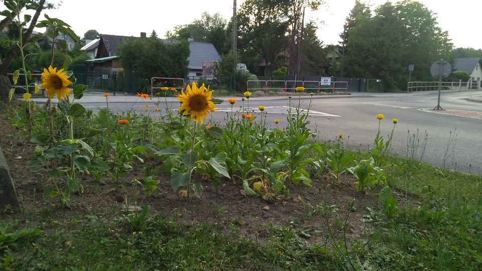 Na zieleńcu „Węgrzce Centrum” mimo bardzo trudnych warunków atmosferycznych, zakwitły pierwsze letnie kwiaty – słoneczniki i nagietki. Doceniamy trud włożony w ich pielęgnację.