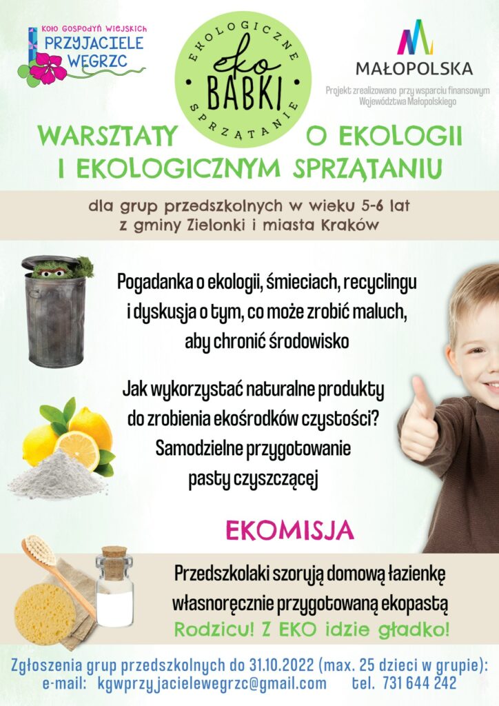 Warsztaty przeznaczone dla grup przedszkolnych z naszej gminy i z terenu miasta Krakowa, skierowane do dzieci w wieku 5-6 lat. Dziękujemy Asi Kubik za przygotowanie wniosku o dofinansowanie projektu, który jest realizowany przy wsparciu finansowym Województwa Małopolskiego.