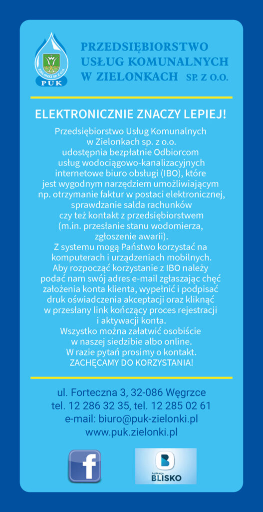 wodociągowo-kanalizacyjnych świadczonych przez PUK Zielonki sp. z o.o. Historia rachunków i saldo, faktury w pdf, wielkość zużyć i inne funkcje