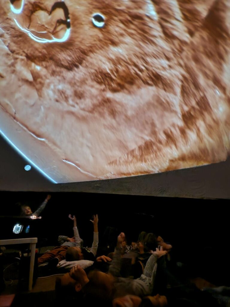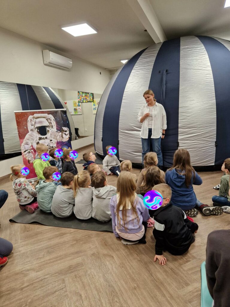 04.03.2023 w budynku Starej Kuźni odbyła się podróż po Układzie Słonecznym w przenośnym planetarium. Dzieci mogły odbyć tą niesamowita podróż leżąc na matach, a planety były na wyciągnięcie ich ręki. Kosmiczną przygodę rozpoczęły z Ziemi. Zaobserwowały księżyc krążący wokół naszej planety. Podleciały rakietą bliżej Układu Słonecznego i dowiedziały się kilka ciekawostek o każdej z planet. Po podróży kosmicznej dzieci odbyły symulację jazdy kolejką górską, co również wywołało u nich dużo emocji. Po wyjściu z kopuły planetarium dzieci mogły zrobić sobie pamiątkowe zdjęcie na tle Kosmonauty.
