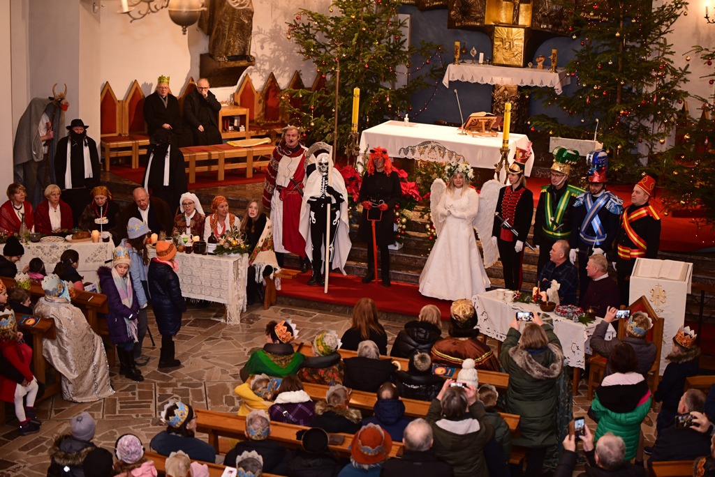 Potem Kościół ” zamienił się” w wiejską chatę sprzed 50 lat. Za suto zastawionymi stołami siedzieli Gospodarze i ich Goście. Sam Gospodarz zaprosił Kolędników na kolędę. W chałupie kolejno pojawiali się Anioł, Marszałek, Król Herod, Hetman, Ułan, Turek, Śmierć, Diabeł, dwaj Żydzi oraz Koza – Aktorzy Grupy Teatralnej działającej przy Parafii w Węgrzcach, członkowie KGW i zaangażowani w inicjatywę mieszkańcy. Zabawiali oni Gości wesołymi tekstami i scenkami oraz pastorałkami i piosenkami. Były też momenty poważne i wzruszające. Nastrój węgrzeckiego kolędowania pięknie na akordeonie budował p. Jerzy Tokarczyk, były organista naszego Kościoła. Teksty wszystkich Postaci były oryginalne, takie jakie mówili Kolędnicy przed 50 laty. O wystrój chałupy zadbały Panie i Panowie z KGW Przyjaciele Węgrzc.