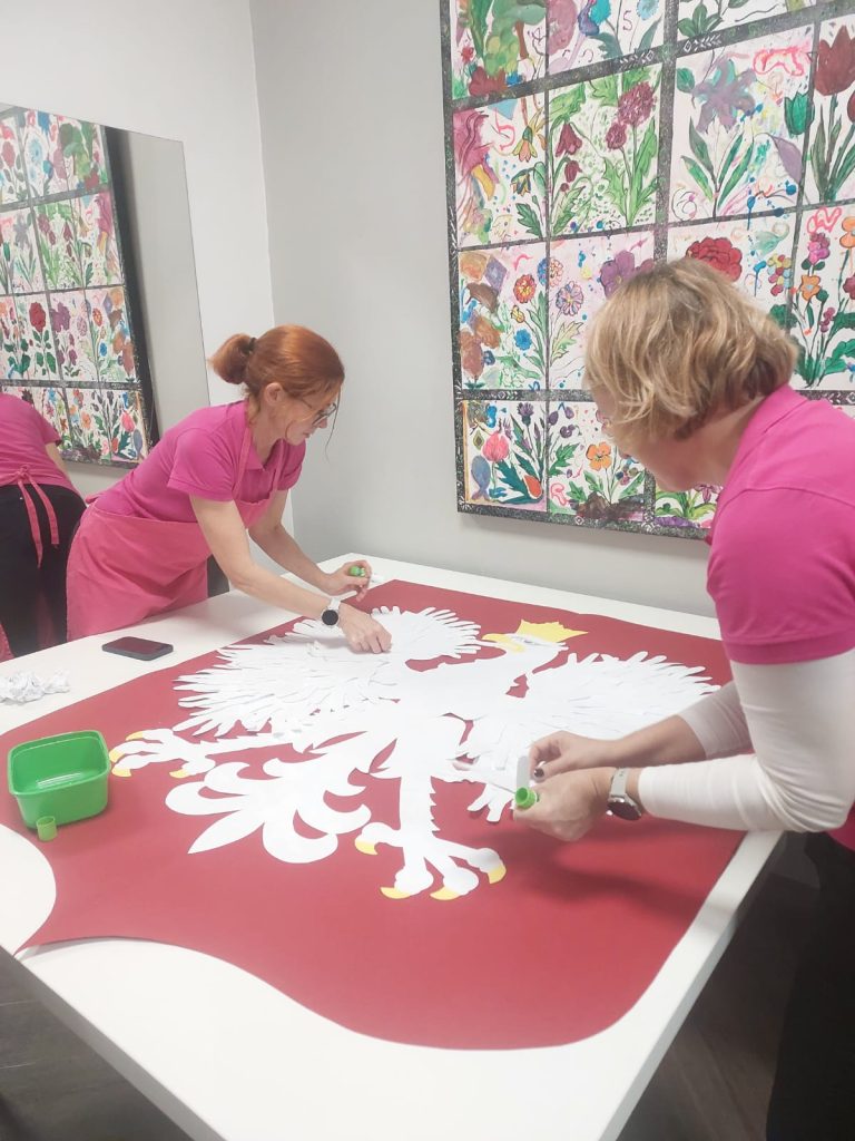 Na zakończenie odbyły się warsztaty plastyczne – wspólnie ozdabialiśmy godło Polski🇵🇱 Każdy Gość odrysował swoją dłoń i przykleił ją do skrzydeł orła. Powstało wyjątkowe dzieło, które pokazuje, że razem możemy stworzyć coś pięknego! 🤍❤️